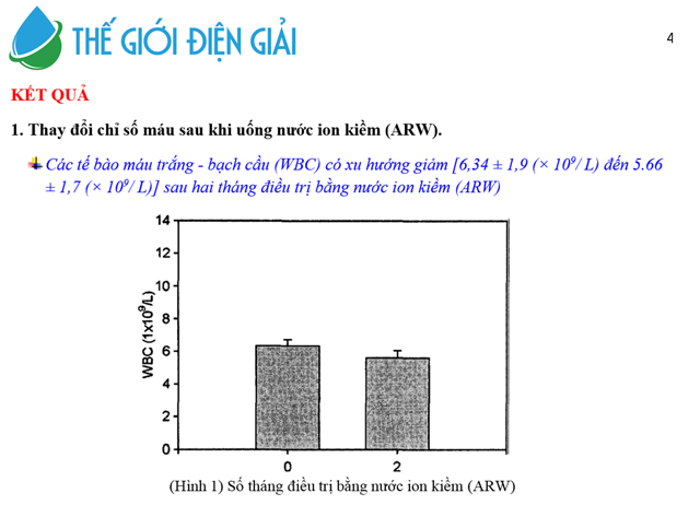 Các tham số máu có xu hướng chỉ ra má»™t Ä‘iá»u kiện váºt chất được cải thiện bởi nước ion kiá»m (ARW). HÆ¡n nữa, chúng tôi không tìm thấy tác dụng có hại cá»§a nước ion kiá»m (ARW) trong nghiên cứu này.